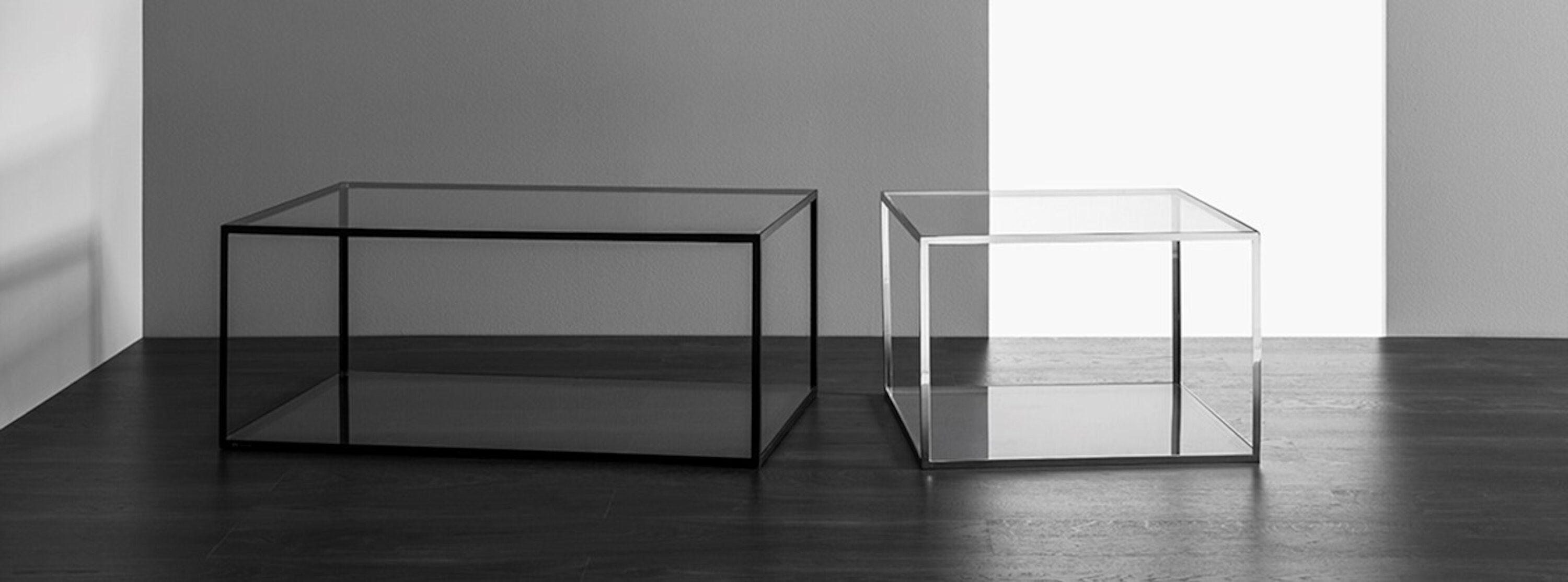 A classic table with a square shape in chrome or black metal, with a glass top and bottom.